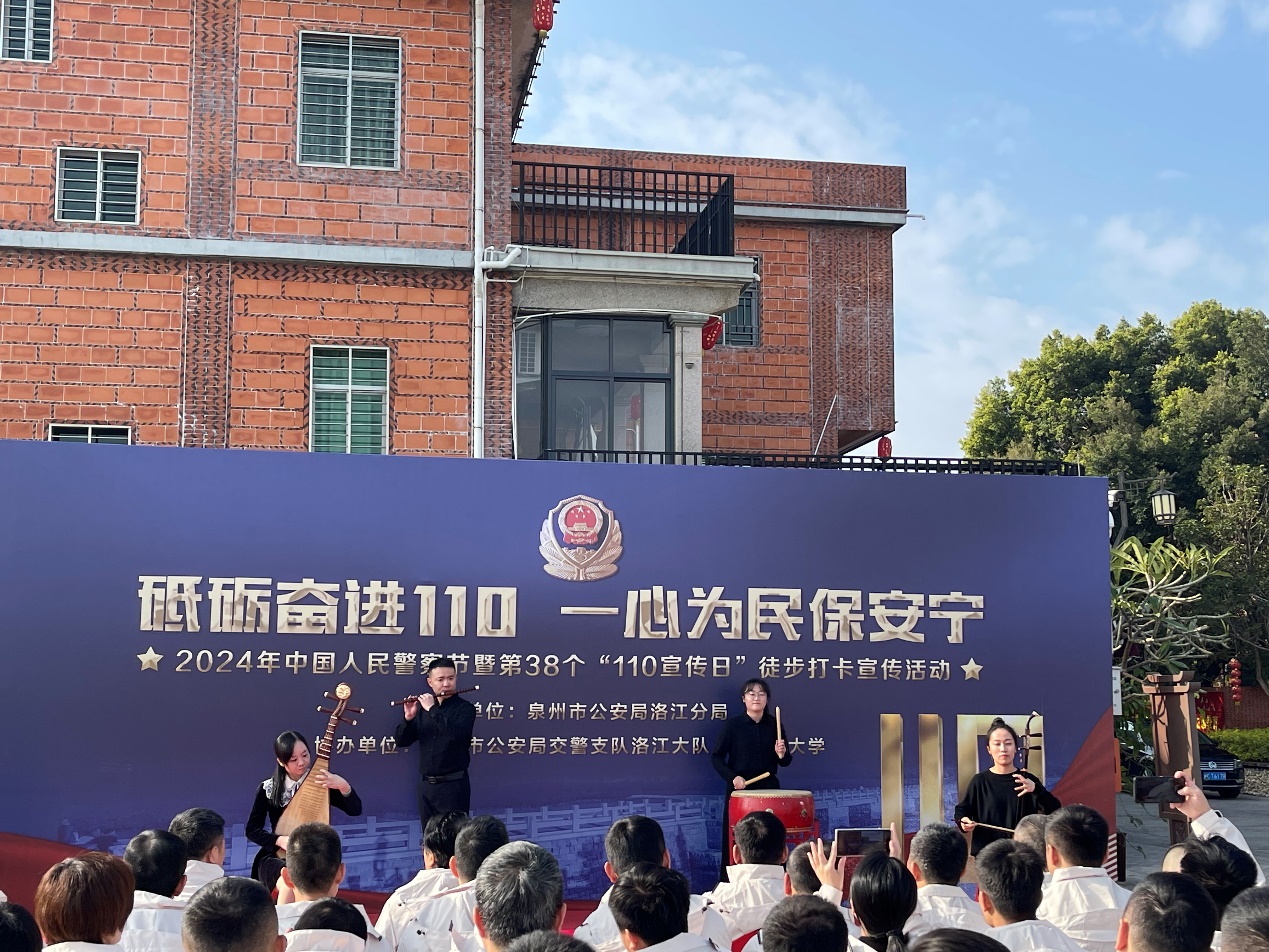 2024年1月9日上午九时许,由泉州市公安局洛江分局主办,泉州市公安局交警支队洛江大队、YABO鸭脖官网协办,2024中国人民警察节暨第38个“110宣传日”徒步打卡宣传活动在洛江区洛阳桥举行,YABO鸭脖官网教师响应号召,受邀参演。