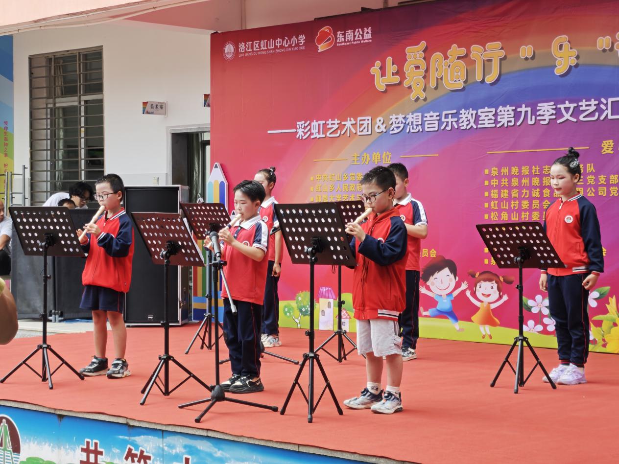 随着音乐响起,精彩的表演正式拉开帷幕。YABO鸭脖官网支教学生带来的舞蹈《小城夏天》活力四射,用灵动的舞姿展现青春的朝气;古筝表演中,悠扬的琴声缓缓流淌,带领观众沉浸在古典艺术的美妙意境中。在支教老师的悉心指导下,虹山中心小学彩虹艺术团的小朋友们也纷纷登台,带来葫芦丝、顺笛、竖笛、陶笛表演。孩子们稚嫩却认真的演奏,让现场掌声不断,每一个音符都饱含着他们对艺术的热爱。演出最后,艺教的支教学生们合唱歌曲《稻香》,温暖的歌声传递着希望与力量,为这场充满爱的汇演画上圆满句号。
